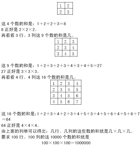 仔細觀察第一行的數是1~100,這100個數的和是5050.第二行的100個數的和恰好比第一行的100個數的和多100;第三行的100個數的和恰好比第二行的100個數的和多100;……第100行的100個數的和恰好比第99行的100個數的和多100.這樣我們可以求出第100行的100個數的和是5050+100×(100-1)=14950再求出這100行的10000個數的總和是(5050+14950)×100÷2=1000000還可以做如下的計算:我們知道,這10000個數正好是100行、100列,我們先看看2行、2列這4個數的和是幾。