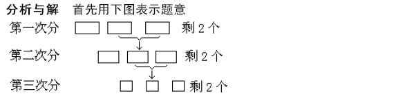 第三次分后,每份的個數不會是1個。如果每份是1個,3份共3個,加上剩下的2個,一共是5個。也就是說,第二次分完后的2份是5個,這是不對的。顯然,第三次分后每份至少是2個,3份共6個,再加上剩下的2個,一共是8個。就是說,第二次分完后,其中的2份是8個。