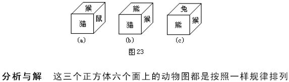 的?墒敲總正方體只能讓我們看到其中的三個面上的動物圖。你要是總看著圖去想,猴的對面是什么動物呢?那是很難想出的。遇到這一類題,可以根據題中給出的條件去想,猴和哪些動物是不對著的,因為這一點很容易看出來。